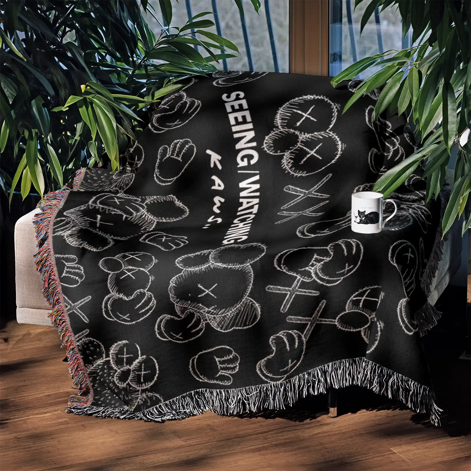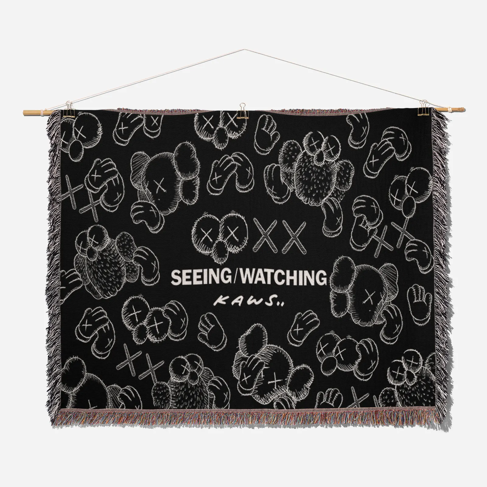 Make a statement with this high-quality, woven Black Kaws tapestry. This durable street art blanket features the distinctive character in a monochrome look, essential for any contemporary art collector.