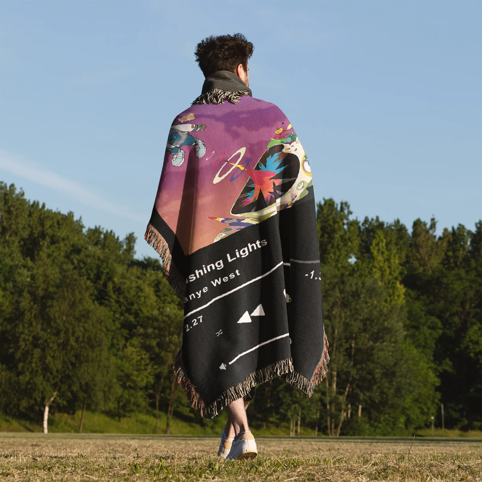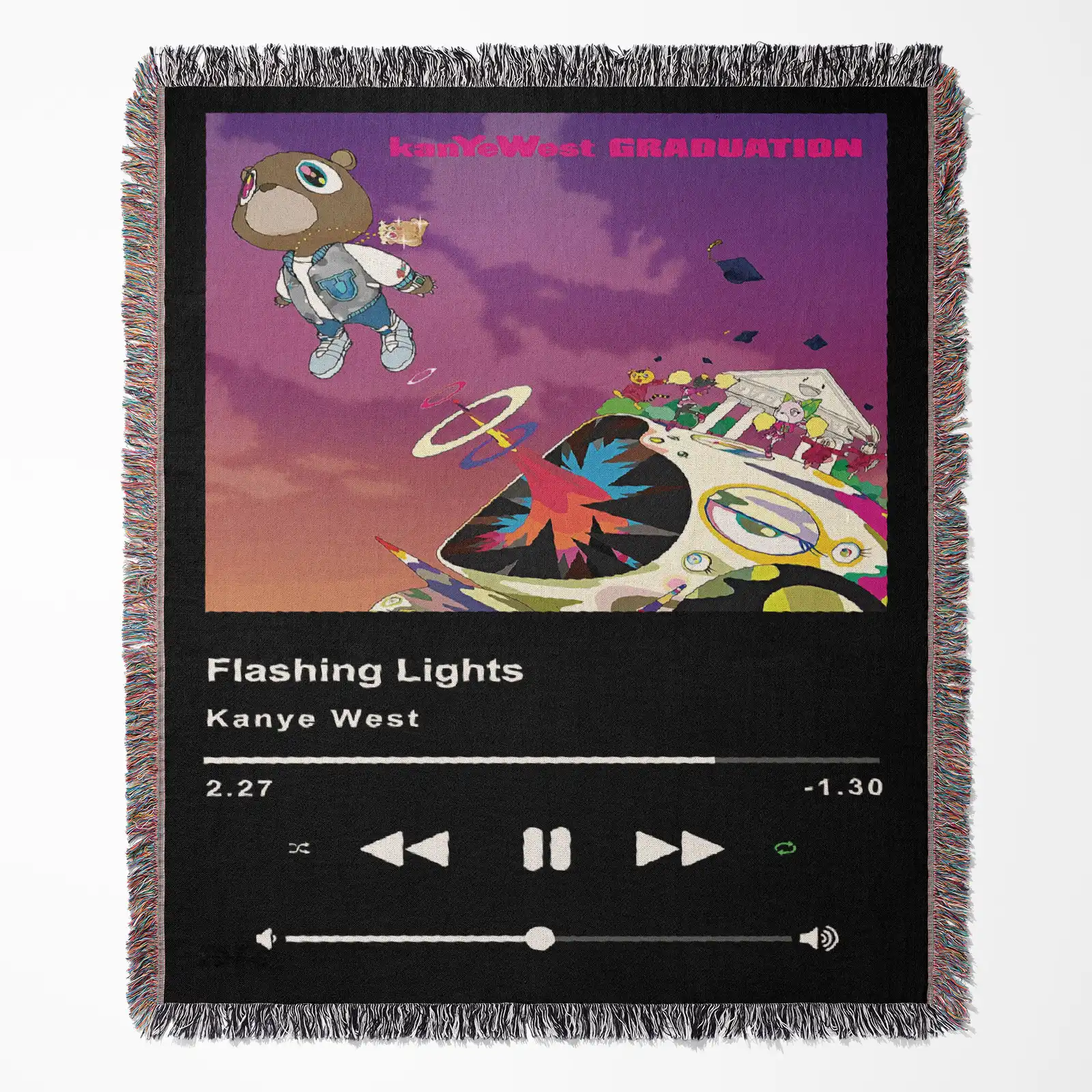 Show your love for the visionary with this high-quality, woven Kanye West tapestry. This durable hip-hop blanket features the Flashing Lights Music Player aesthetic, essential for fans of Ye's iconic *Graduation* era.