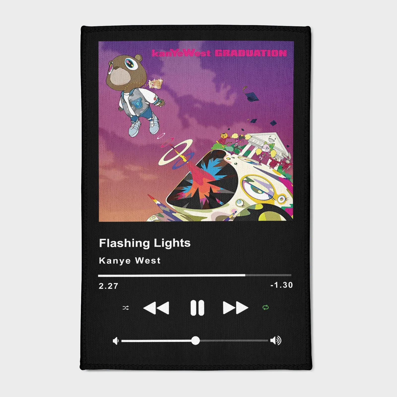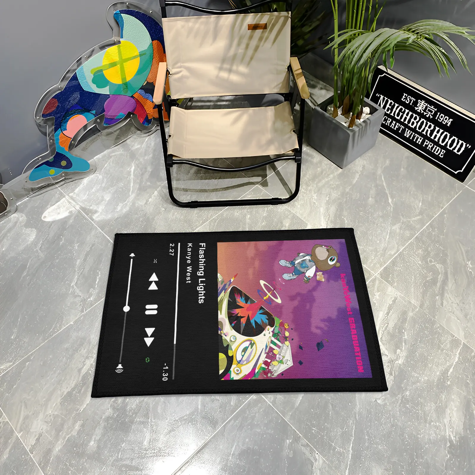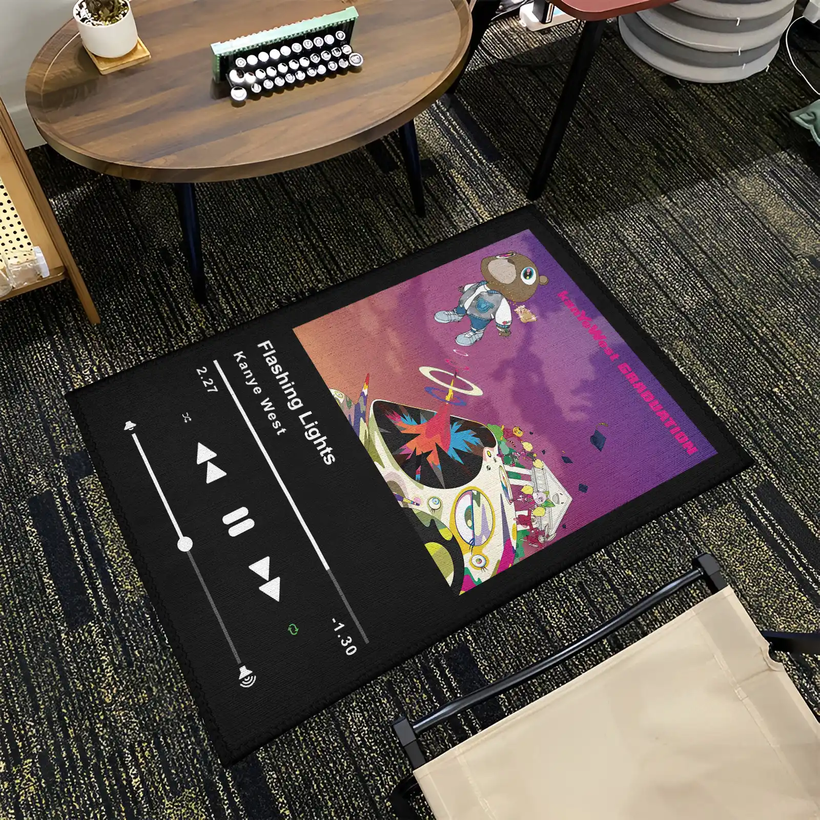 Illuminate your room with the iconic track using the Flashing Lights Kanye West Music Player Rug. This unique floor mat blends a vintage music player design with a theme inspired by the influential song, making it a powerful and durable statement piece for music lovers, studios, or stylish bedrooms.Product Features