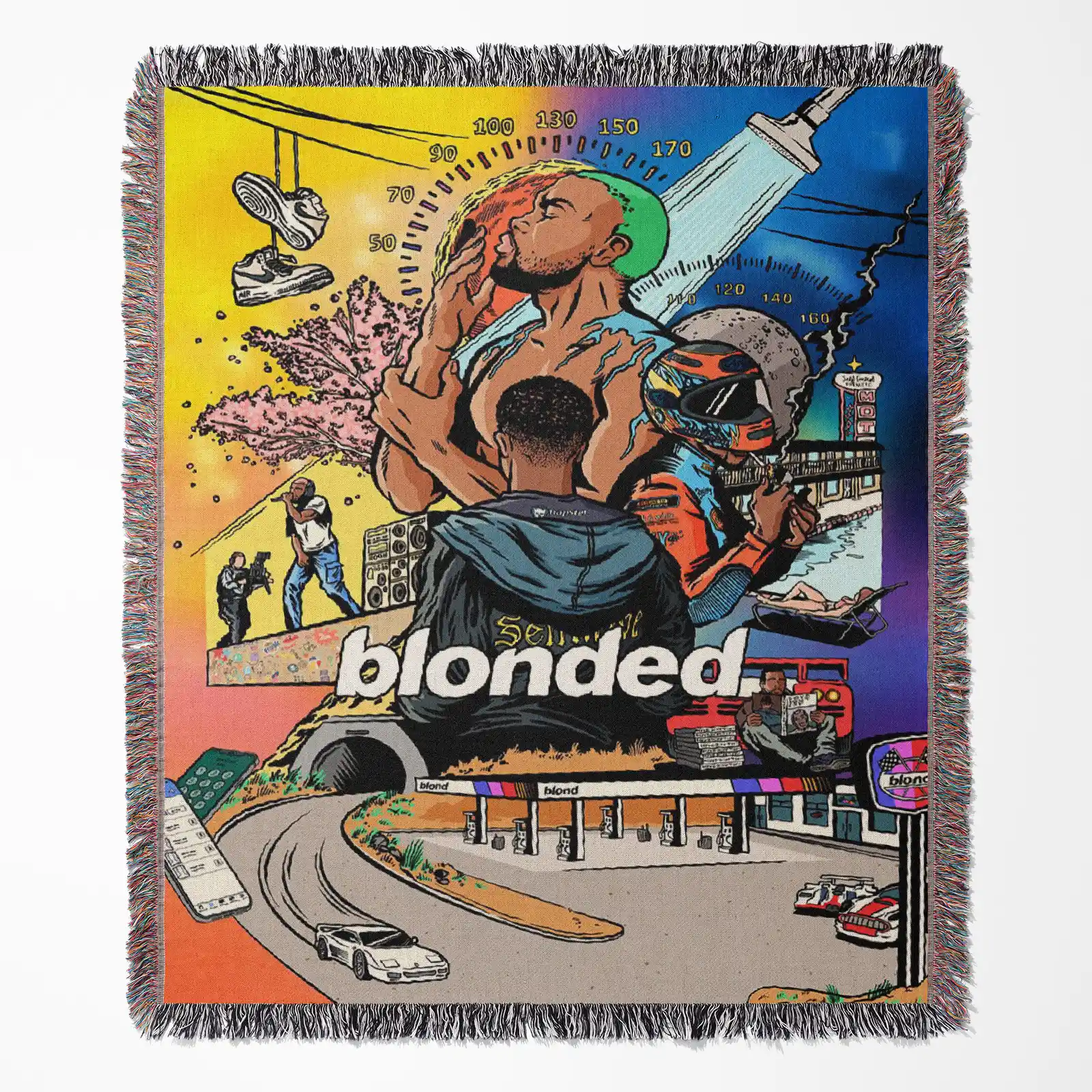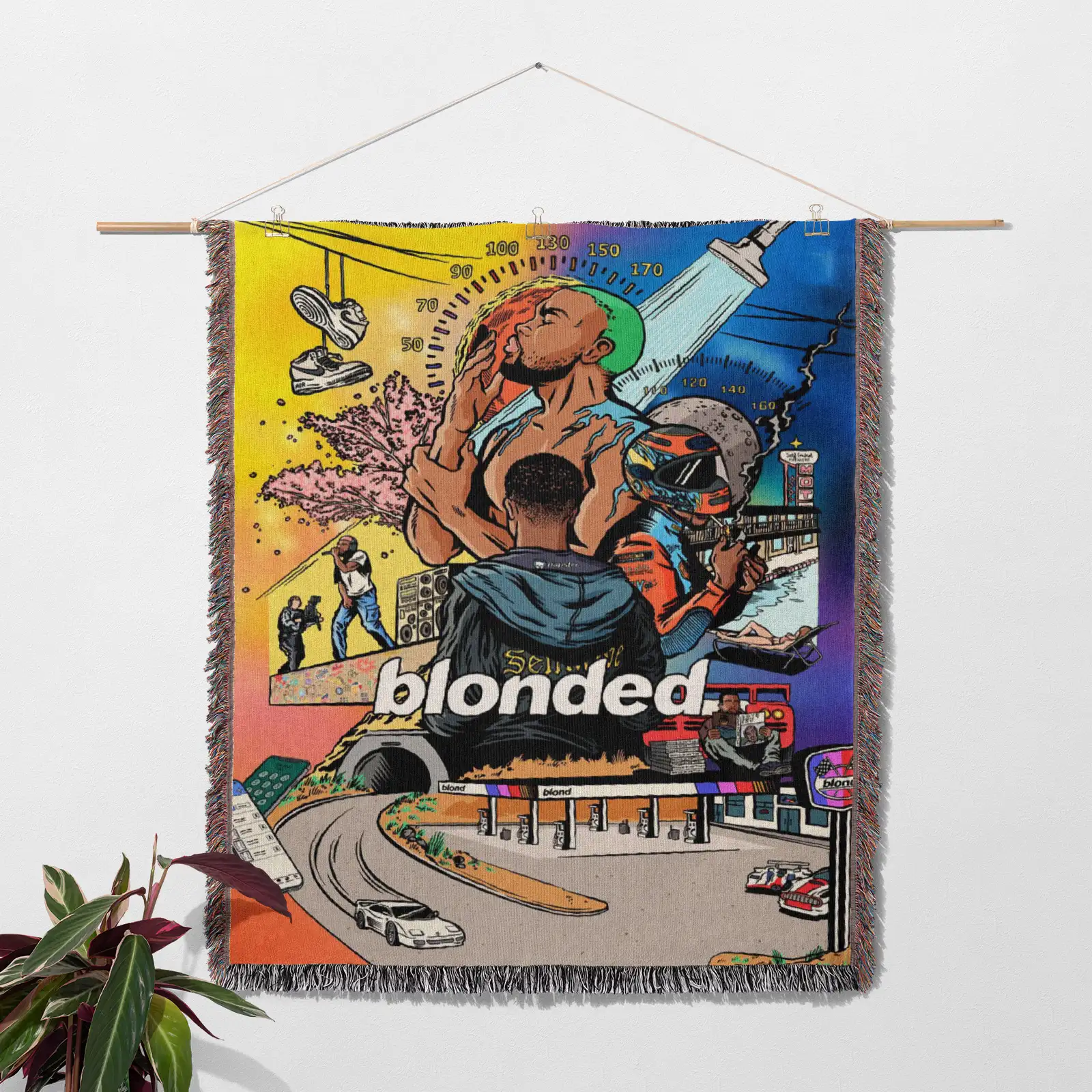 Embrace the smooth aesthetic with this high-quality, woven Frank Ocean tapestry. This durable R&B blanket features the iconic Blonded album poster design, essential for any fan of alternative music.