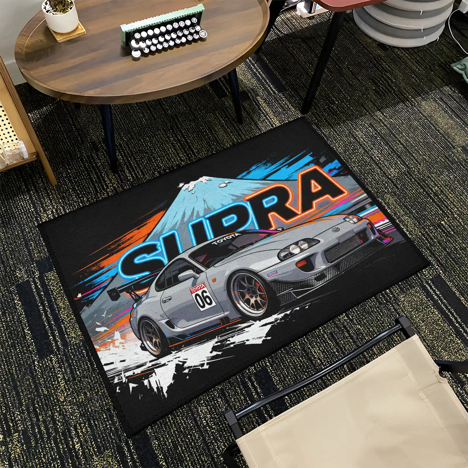 Ignite your passion for Japanese engineering with the JDM Supra Race Car Rug. Featuring dynamic graphics of the legendary Toyota Supra, this durable floor mat is essential decor for the gearhead's garage, man cave, game room, or any space dedicated to high-performance JDM culture.Product Features