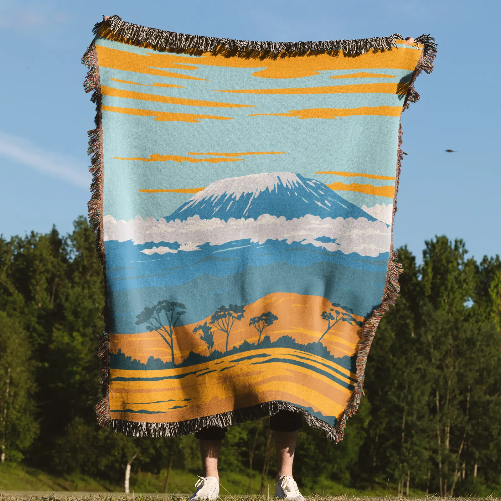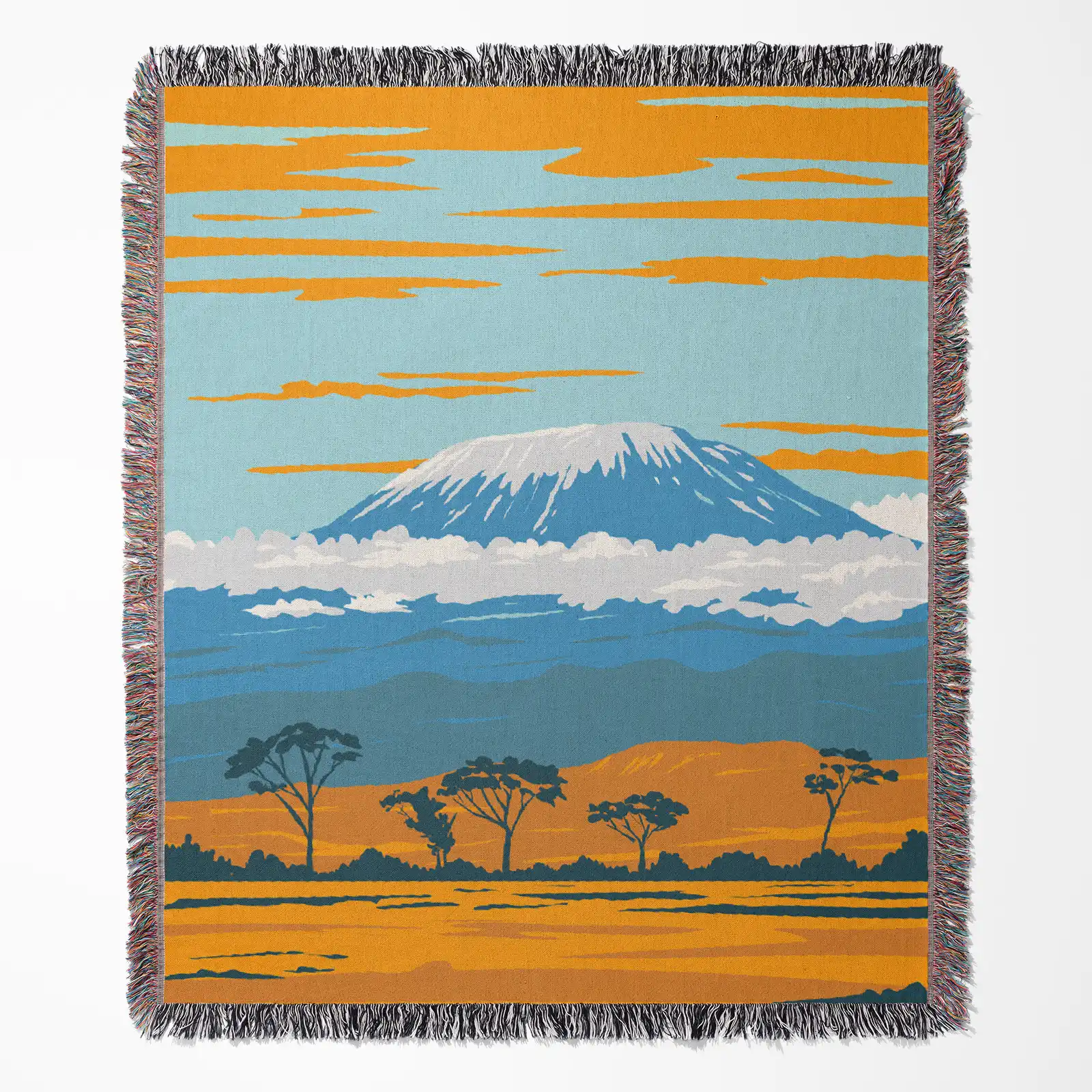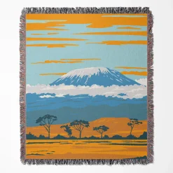 Capture the spirit of adventure with this high-quality, woven Kilimanjaro tapestry. This durable landscape blanket features the majestic mountain in a striking flat design style, perfect for fans of travel and nature.