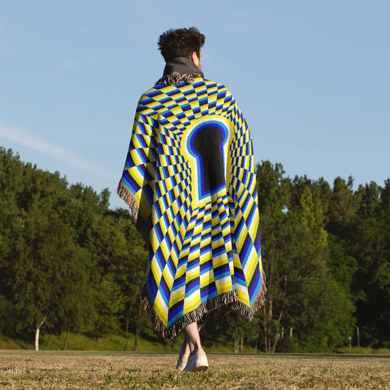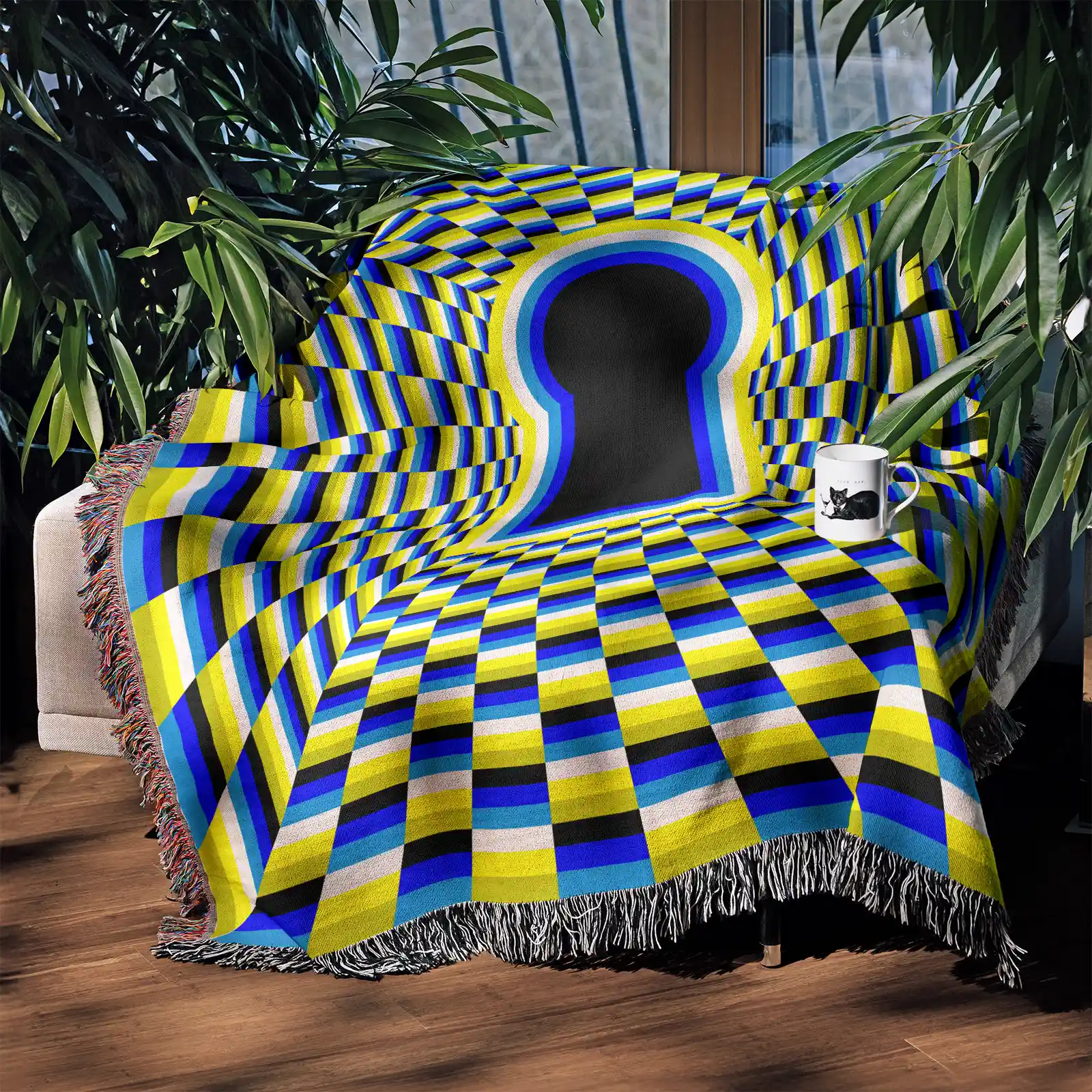 Transform your space with this high-quality, woven optical illusion tapestry. This durable abstract art blanket creates a unique visual effect, perfect for a trippy decor aesthetic.
