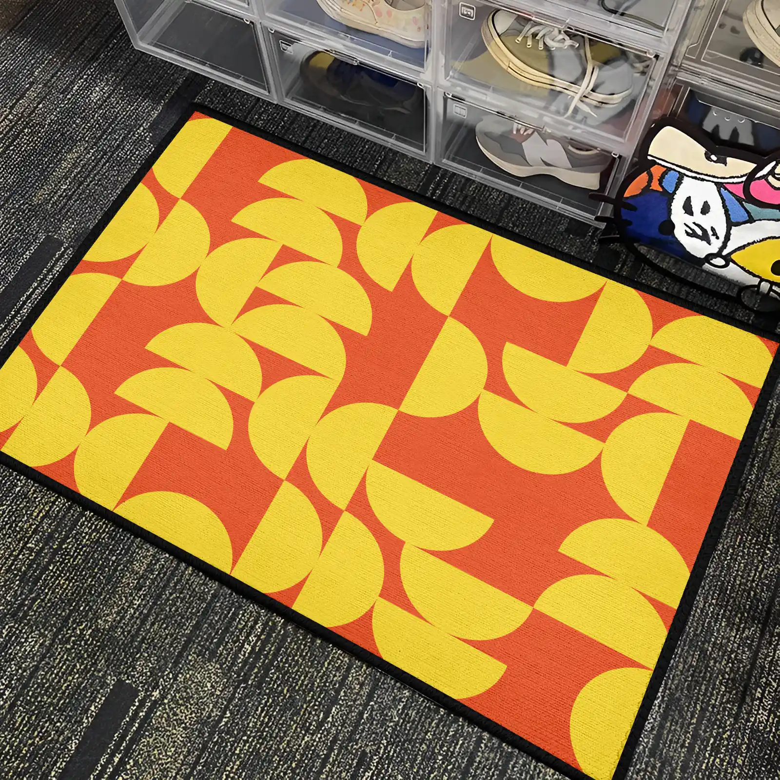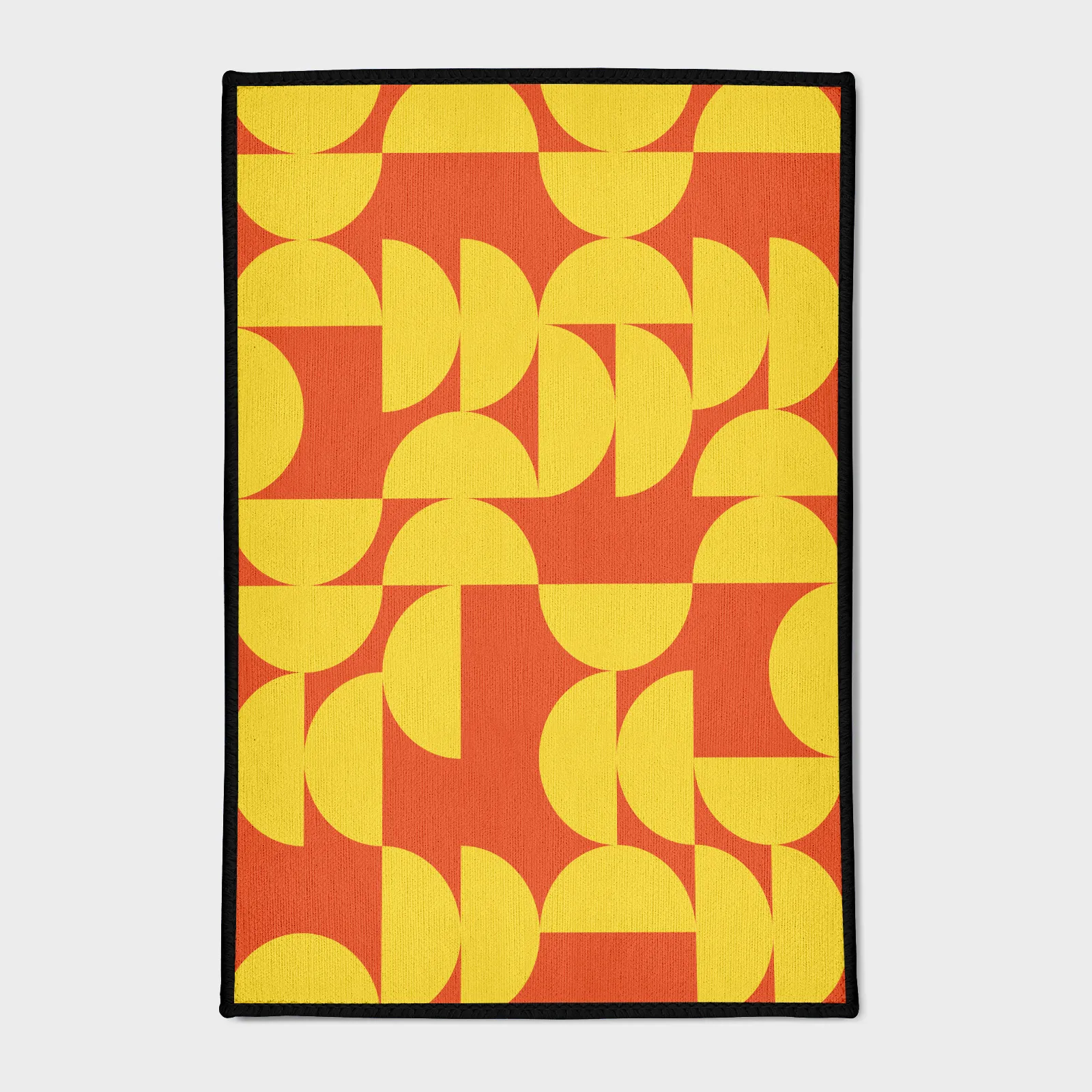 Add a vibrant burst of mid-century flair with the Orange and Yellow Geometric Half-Circles Rug. This visually striking mat features bold, interlocking half-circle patterns in warm colors, making it a perfect statement piece for retro-inspired dens, modern offices, or contemporary living areas.Product Features