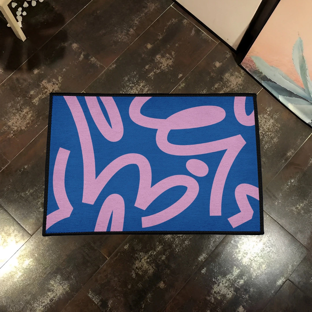 Infuse your space with modern artistry using the Pink Abstract Curves on Blue Rug. This stunning floor mat features fluid pink lines and shapes set against a soothing blue background, creating a soft yet dynamic contemporary aesthetic perfect for living rooms, creative studios, or chic bedrooms.