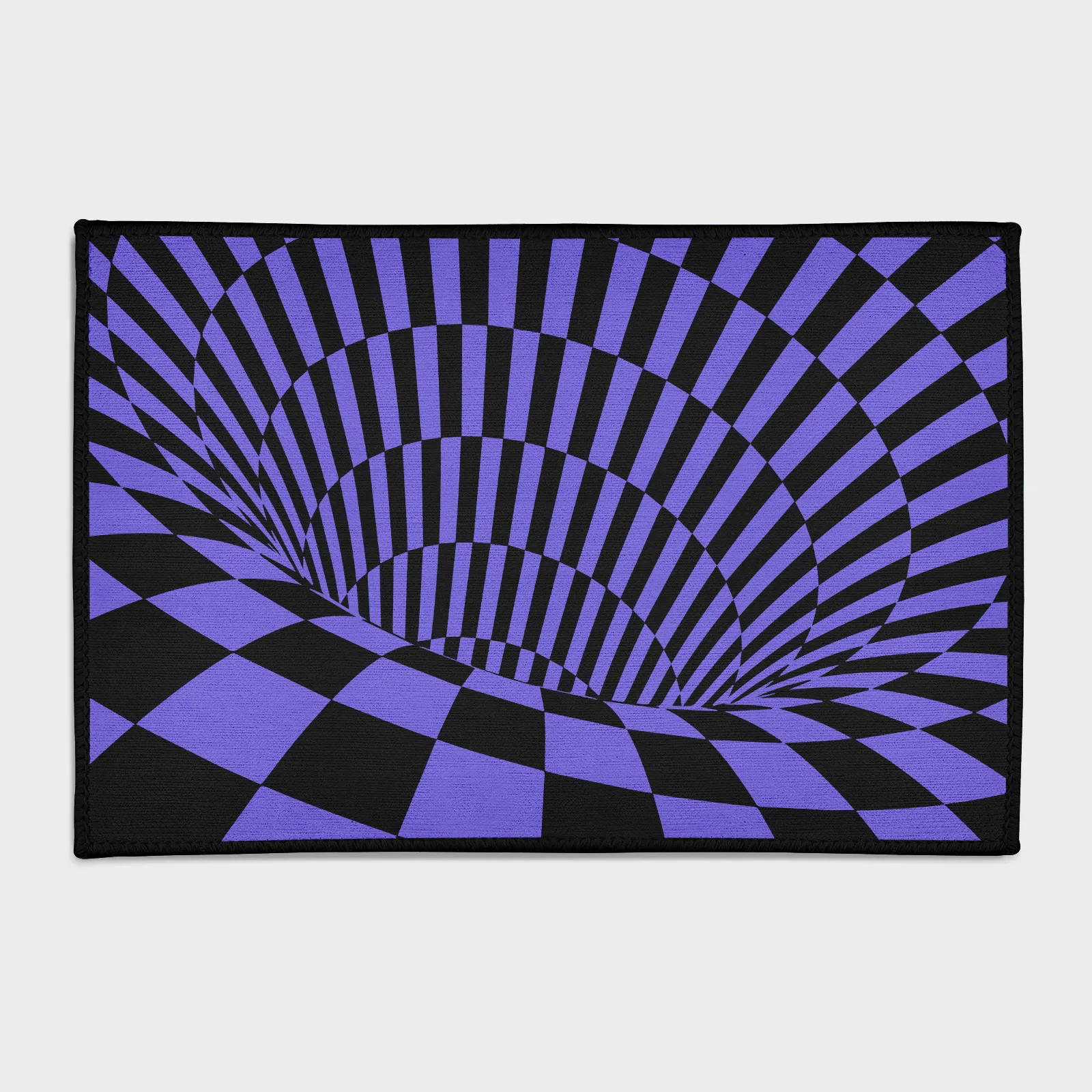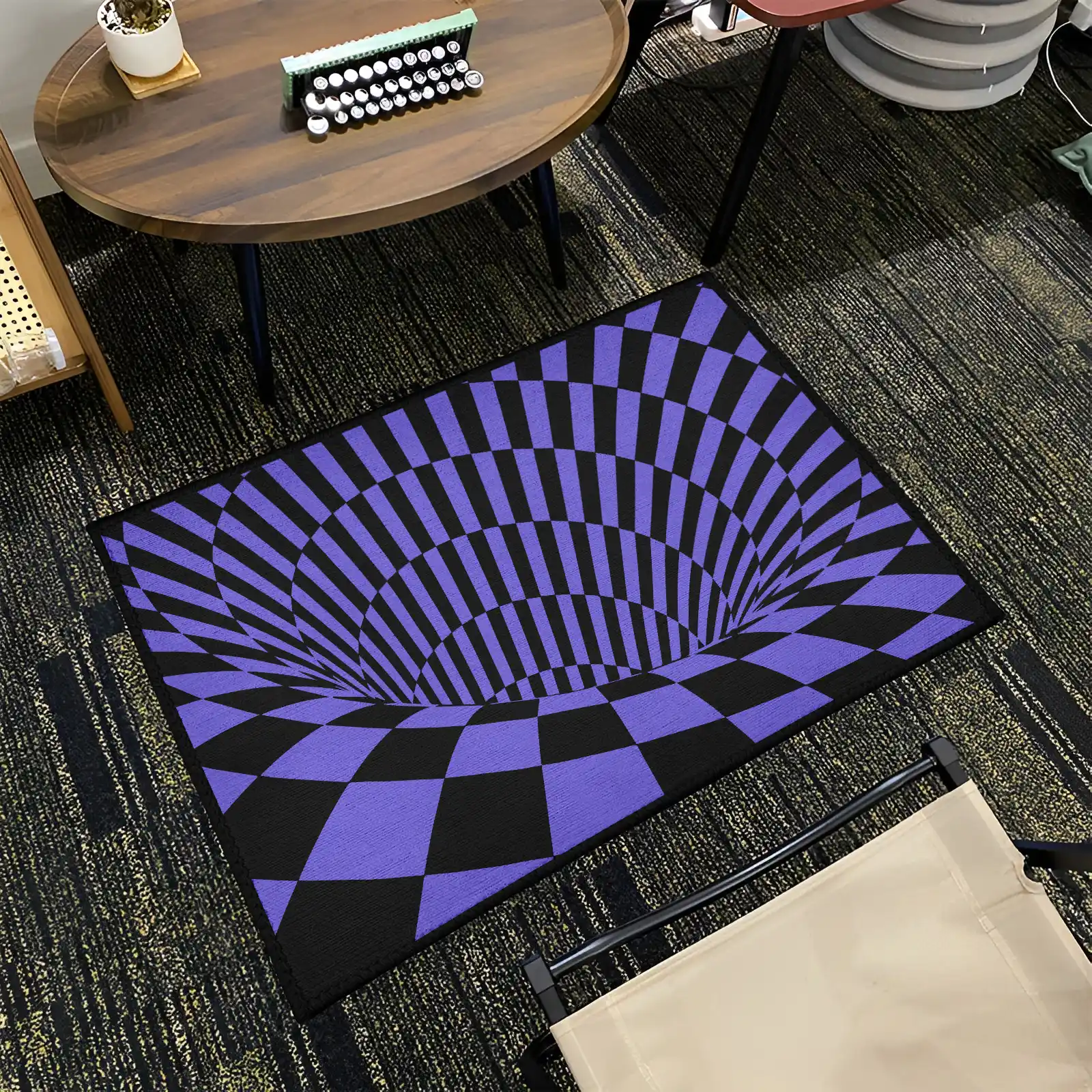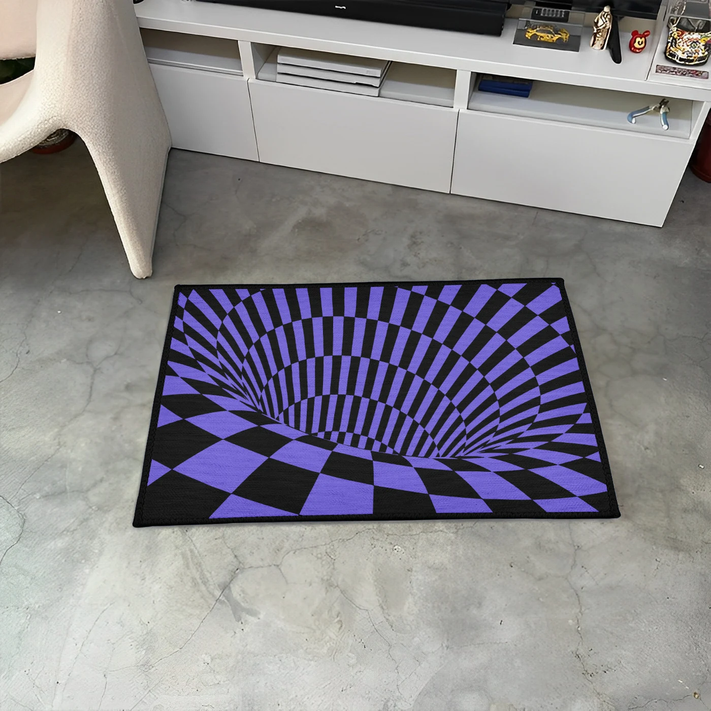 - Intense 3D Tunnel Illusion – Features stark black and purple lines that create a striking, deep tunnel or vortex effect on the floor.