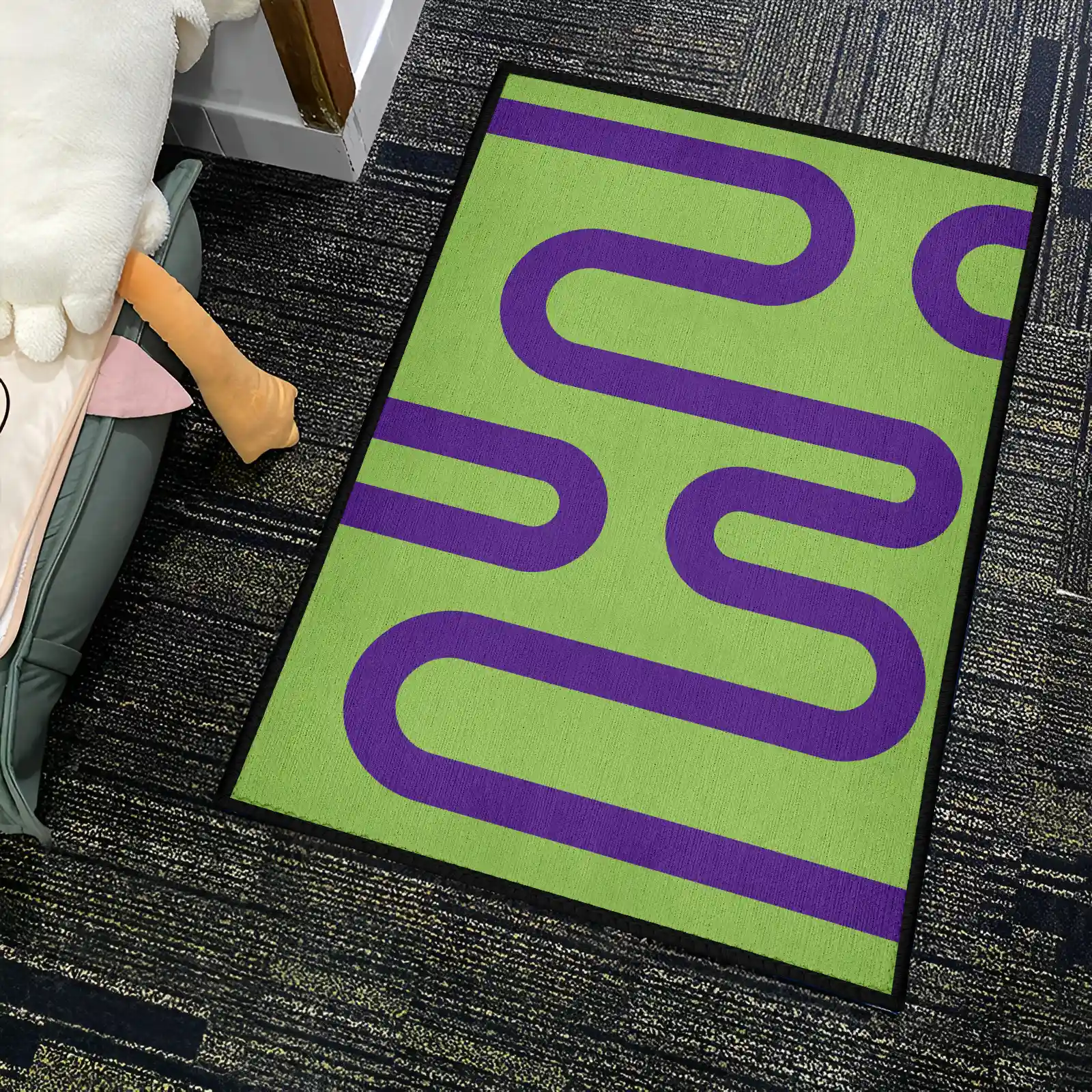 Purple Curved Lines on Green Rug