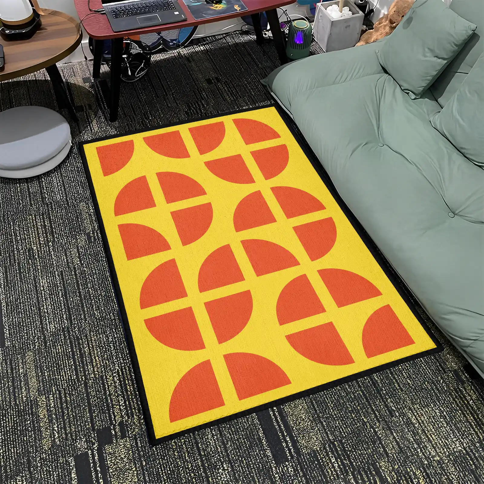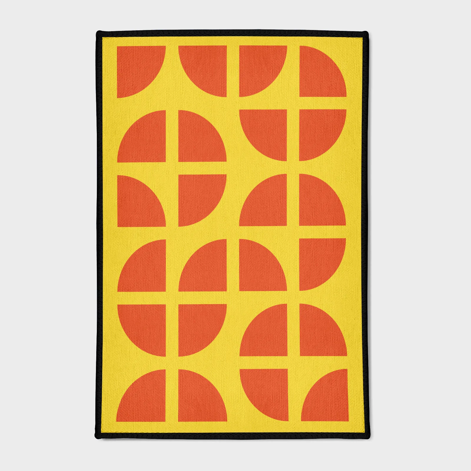 Energize your space with the retro-modern look of the Red Half-Circles on Yellow Grid Pattern Rug. This geometric floor mat features a striking, high-contrast design that is perfect for adding a mid-century modern or contemporary aesthetic to living rooms, offices, or bedrooms.Product Features