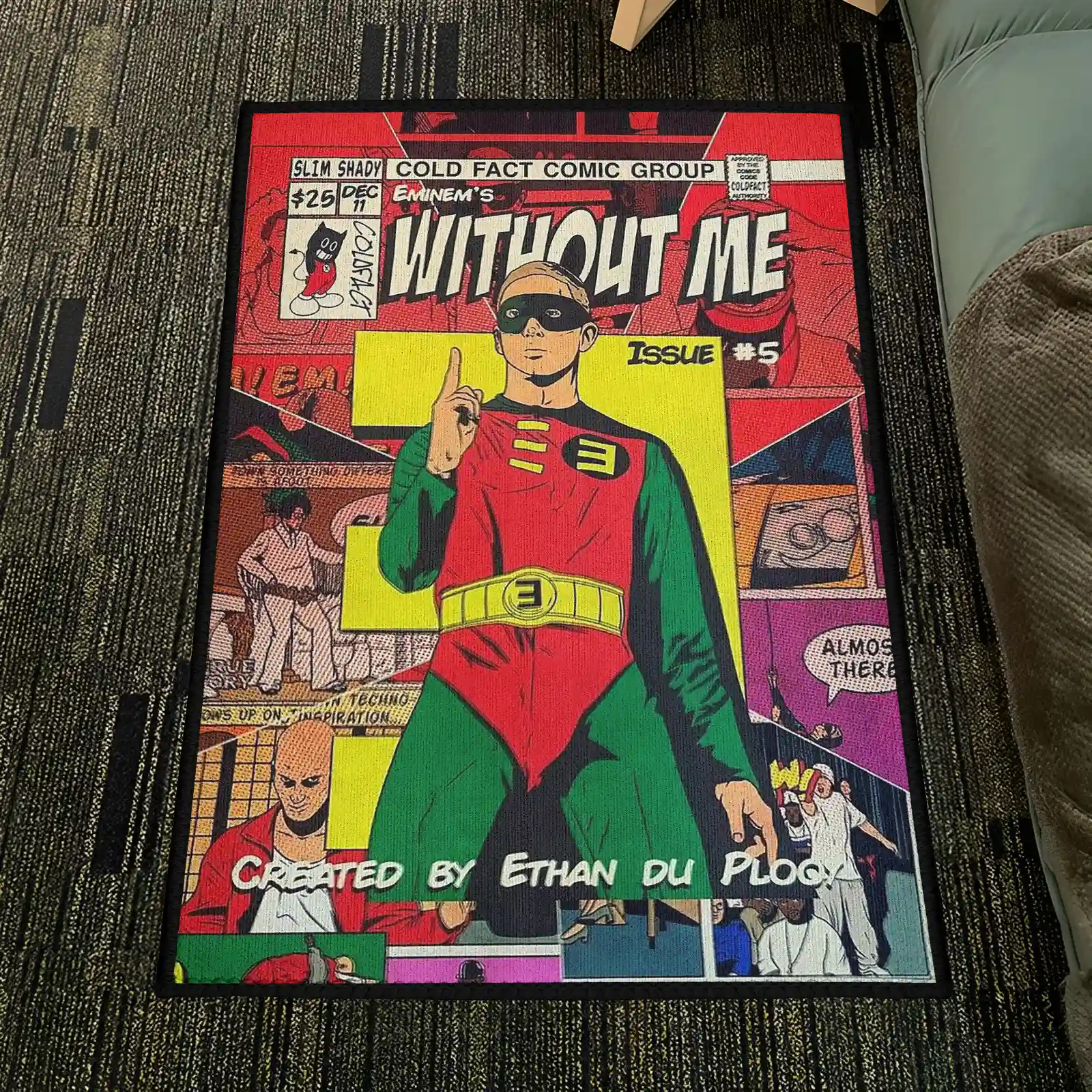 Mix music and comics with the Without Me Eminem Comic Poster Rug. Featuring the iconic track title blended with a vibrant, vintage comic book aesthetic, this durable floor mat is a must-have for Eminem fans, adding a nostalgic, graphic edge to bedrooms, man caves, or entertainment rooms.Product Features