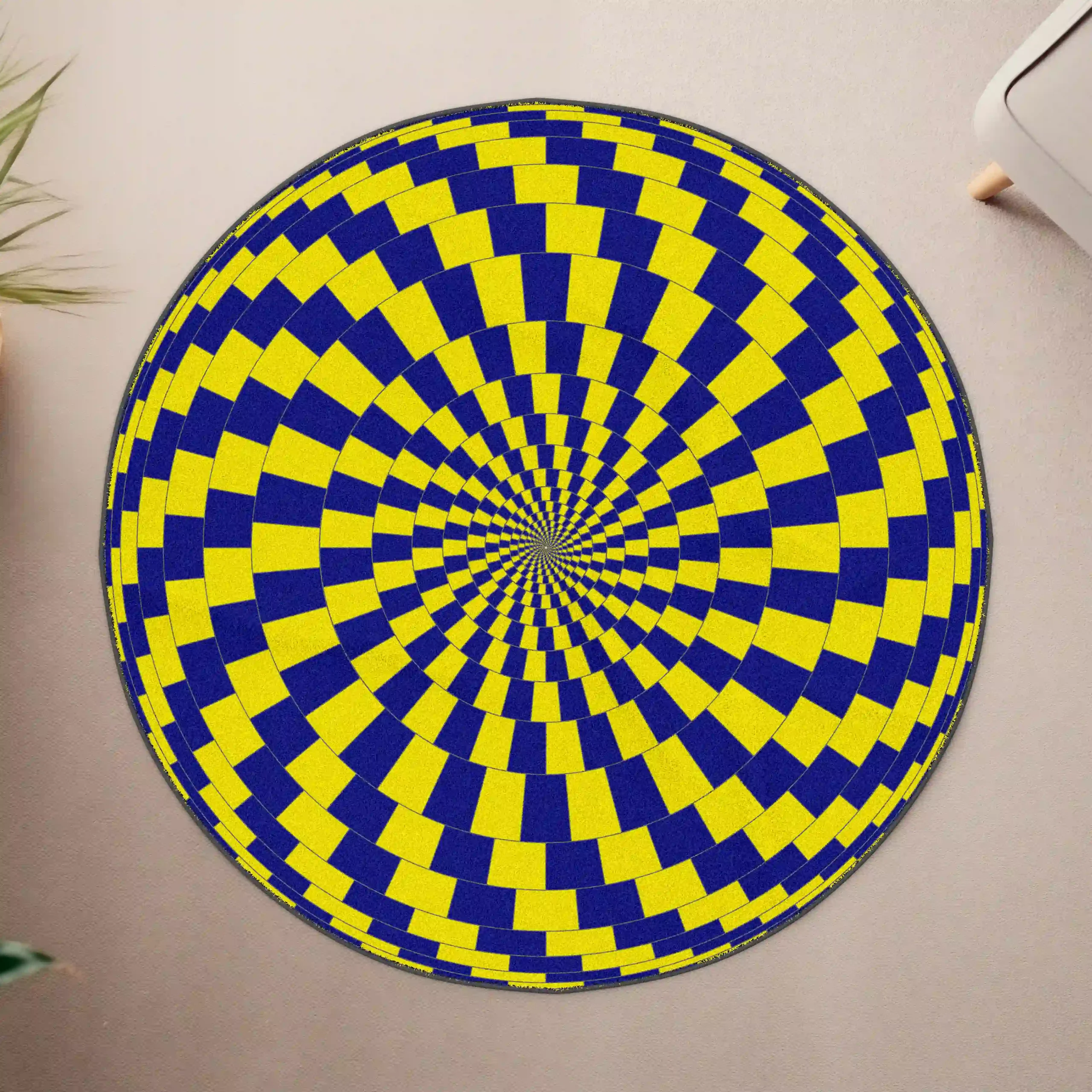 Add a mesmerizing visual twist to your space with the Yellow and Blue Optical Illusion Circular Rug. Featuring a bold yellow and blue pattern that creates a captivating 3D effect, this rug is perfect for bedrooms, living rooms, or game rooms that crave a modern, artistic touch.Product Features
